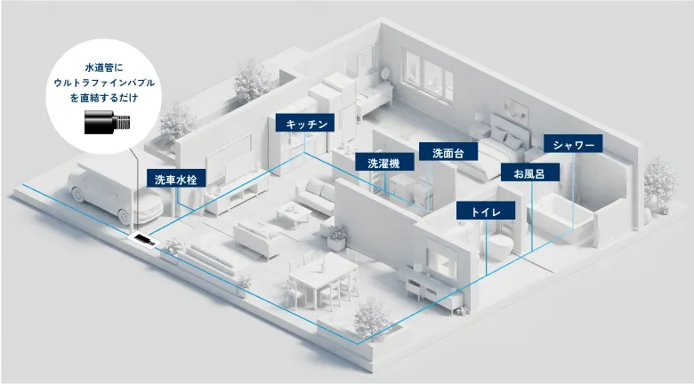 ウルトラファインバブルアイ工務店の住まいでは、水道管に専用機器を設置し、すべての水をウルトラファインバブル水に。